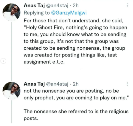 “Holy Ghost Fire, nothing’s going to happen to me, you should know what to be sending to this group, it’s not that the group was created to be sending nonsense, the group was created for posting things like, test assignment e.t.c. not the nonsense you are posting, no be only prophet, you are coming to play on me.” The nonsense she referred to is the religious posts.”