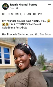 An Istanbul-based Nigerian Man, Iwuala Nnamdi has said his cousin, Favour Amajor, was kidnapped in Abuja.
