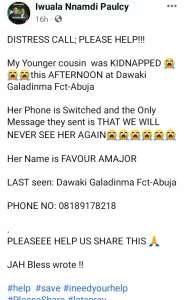“Her Name is FAVOUR AMAJOR. LAST seen: Dawaki Galadinma Fct-Abuja. PHONE NO: 08189178218. PLEASEEE HELP US SHARE THIS. JAH Bless wrote !!”