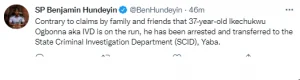 ”Contrary to claims by family and friends that 37-year-old Ikechukwu Ogbonna aka IVD is on the run, he has been arrested and transferred to the State Criminal Investigation Department (SCID), Yaba.”he tweeted