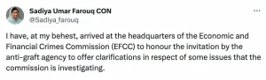 Umar-Farouk took to her X account to announce the development, saying “I have, at my behest, arrived at the headquarters of the Economic and Financial Crimes Commission (EFCC) to honour the invitation by the anti-graft agency to offer clarifications in respect of some issues that the commission is investigating.