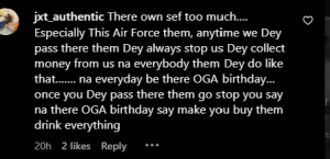 “Their own is too much… Especially this Air Force people. Anytime we pass there, they always stop us and collect money. It’s the same for everyone. Every day is their Oga‘s birthday — once you pass, they stop you and say it’s their Oga‘s birthday, asking you to buy them drinks and everything,” the user wrote.